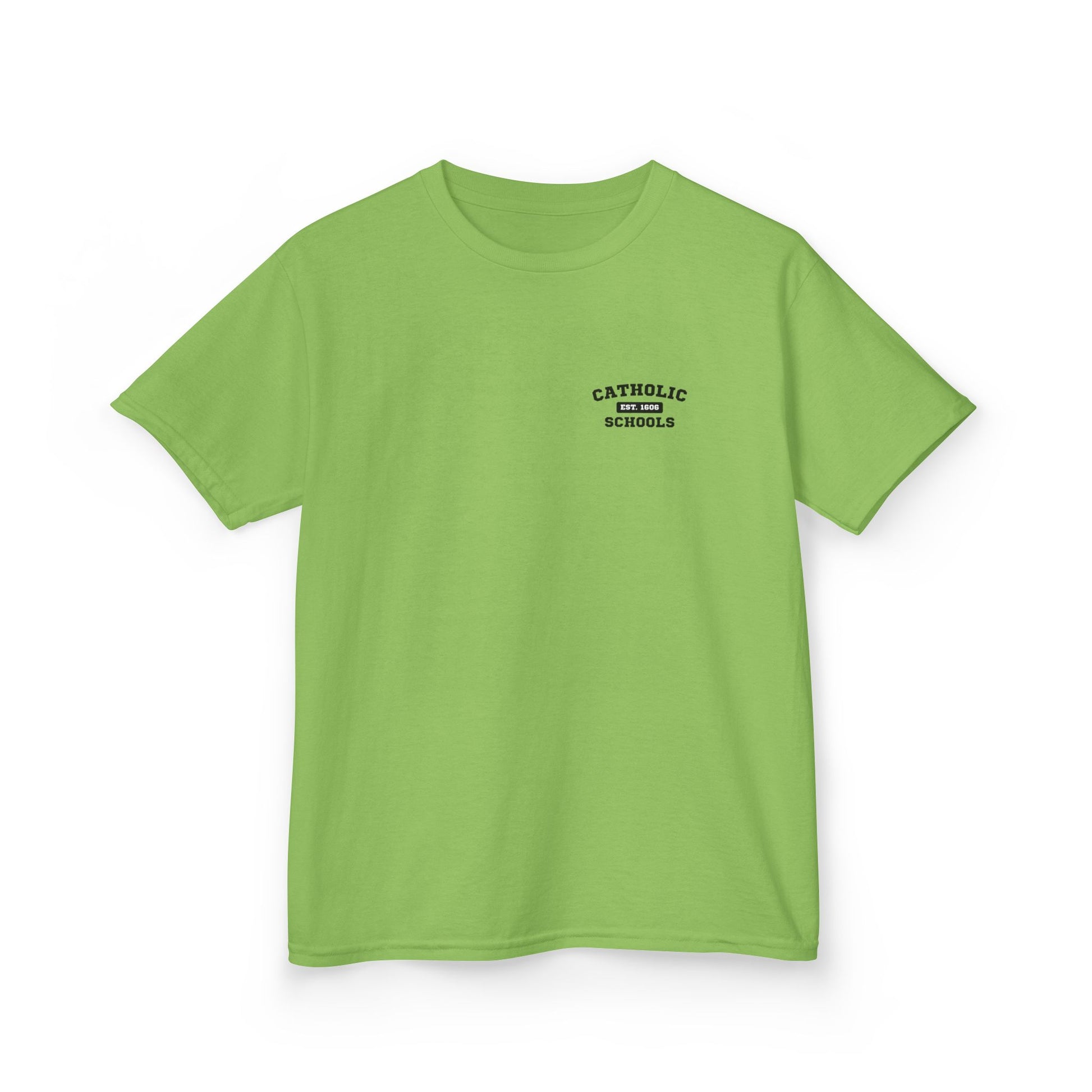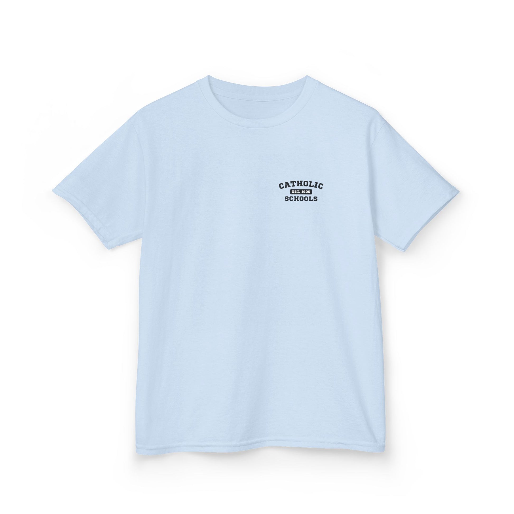 Part of our Catholic Schools Series – five limited-edition youth tees that all feature the same classic “Catholic Schools Est. 1606” logo on the chest and a unique, faith-fueled message on the back.