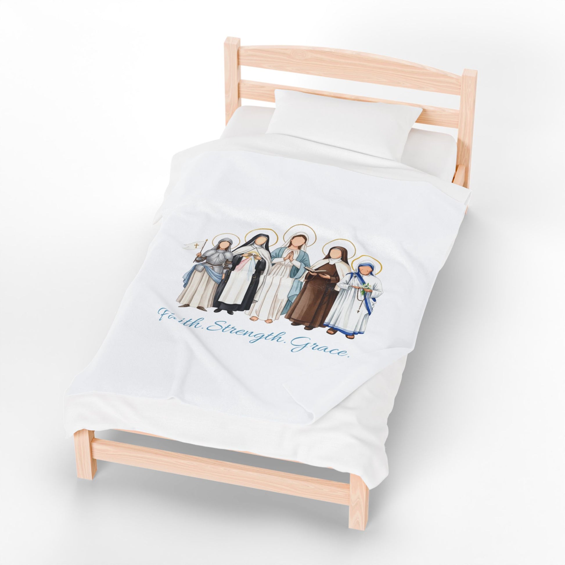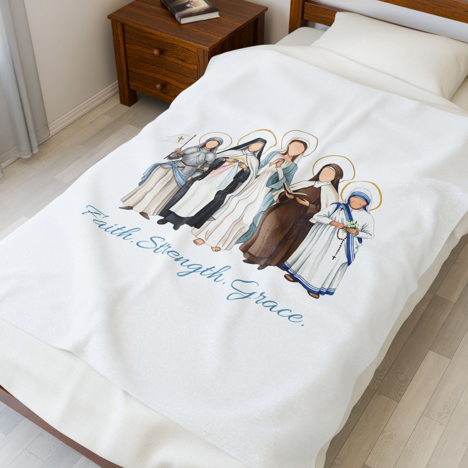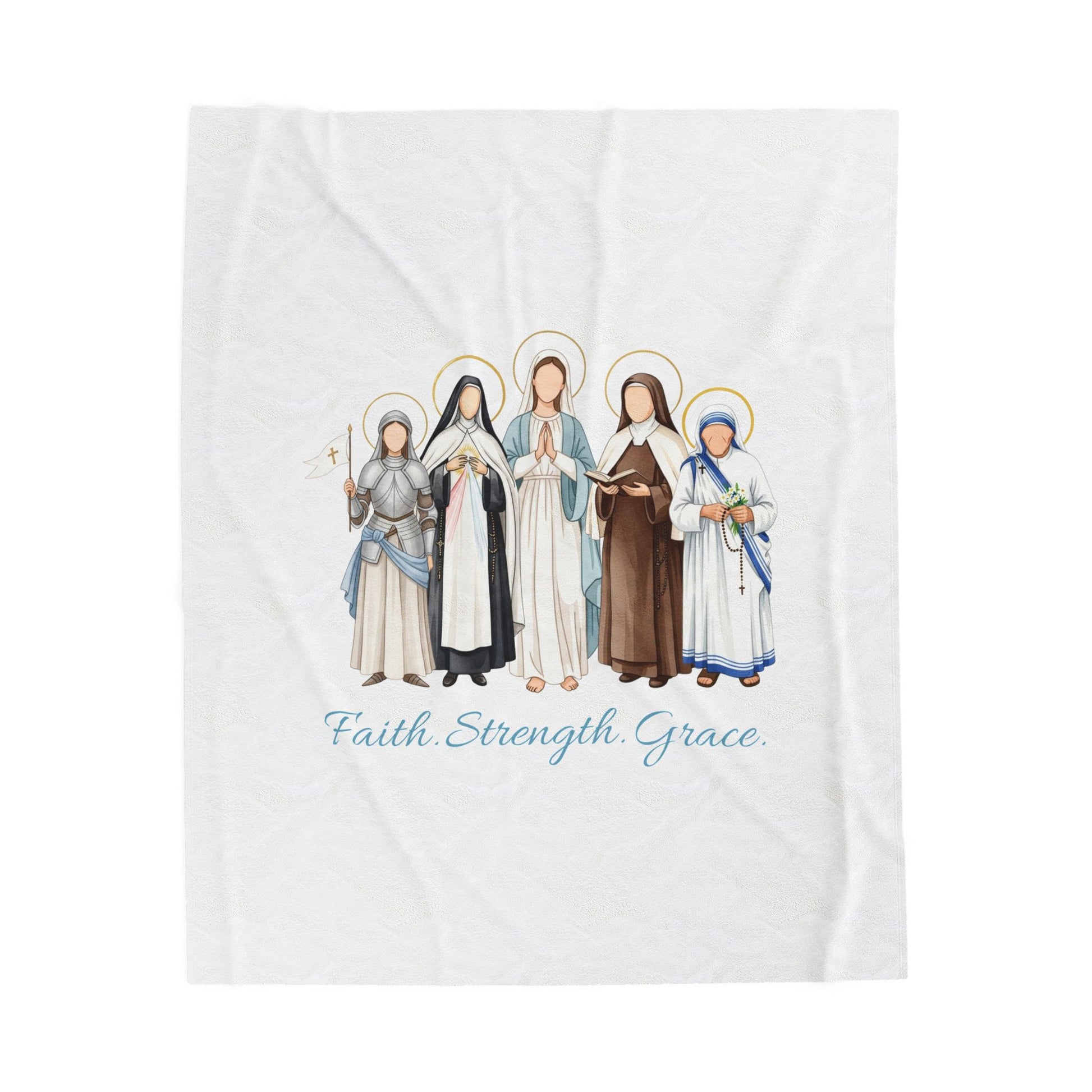 This luxurious velveteen plush blanket features the same beloved women saints illustration and the gentle words “Faith • Strength • Grace” in delicate script. Perfect for draping over your prayer chair, curling up during Adoration, or adding a touch of sacred beauty to your couch or bed. One side is printed with vibrant, high-detail artwork; the other side is crisp white plush for ultimate coziness.