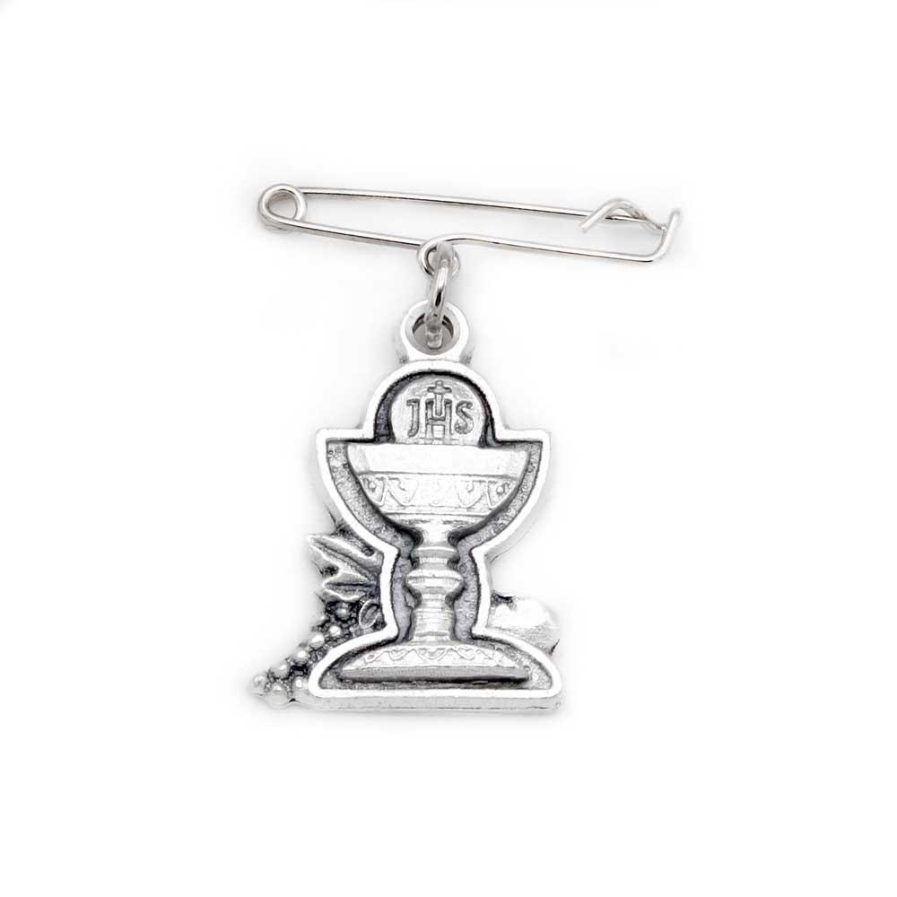 This silver-tone First Communion lapel pin features a highly detailed JHS chalice. The dangling charm sets this lapel pin apart from other First Communion pins. Ideal for religious education classes or as a lovely First Communion gift for both boys and girls. Made in Italy.