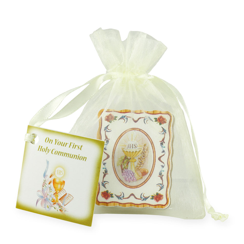 First Holy Communion rosary gift set features a rosary with white wooden beads, a white wooden crucifix with a silver-finished corpus, silver-polished Our Father beads, and a wooden chalice center piece. The rosary comes in a beautifully designed colorful wood box with suede lining and features an image of the Eucharist on the lid. This lovely piece of art is handcrafted in Italy.