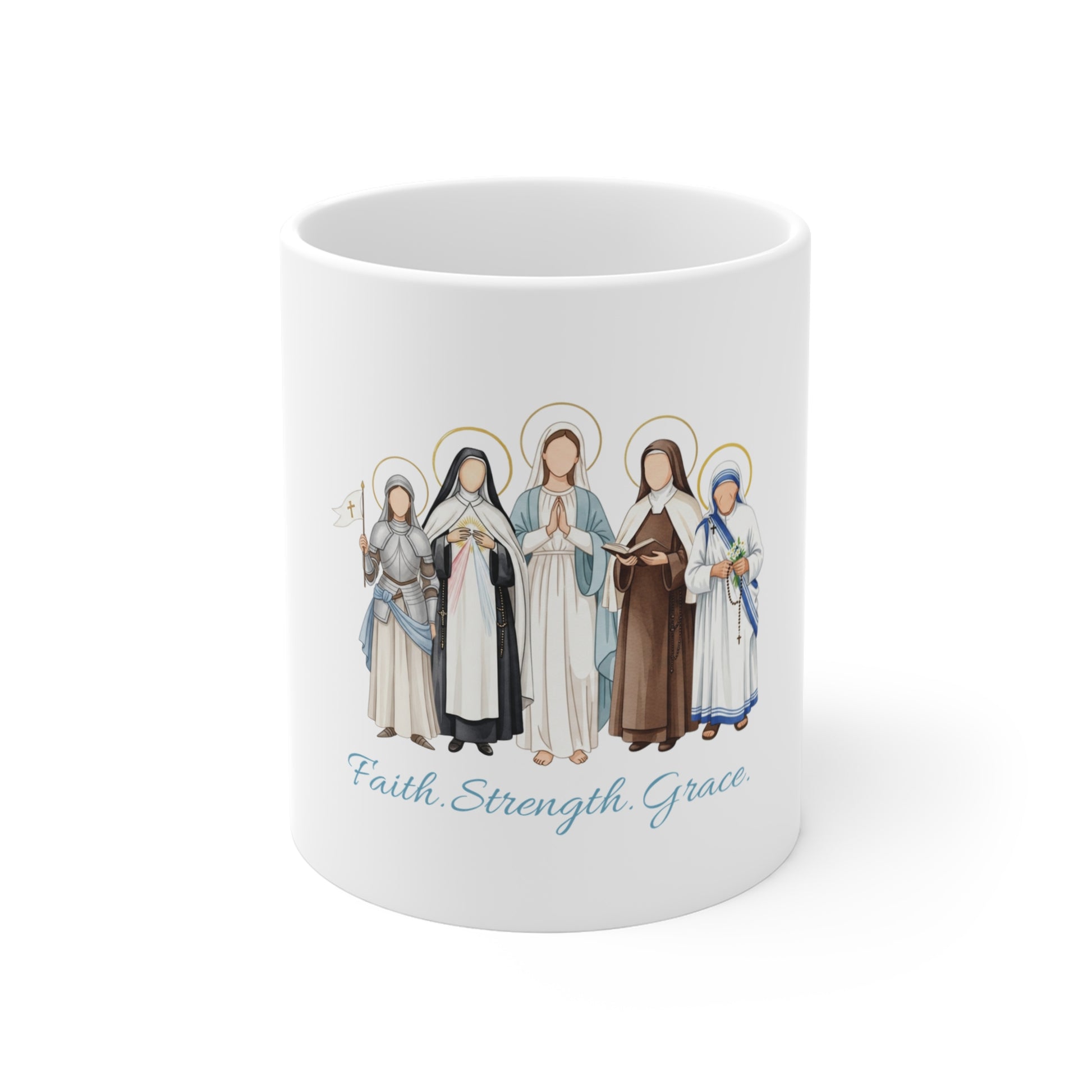 Faith Strength Grace Catholic Mug - Women Saints 11oz Ceramic Coffee Cup