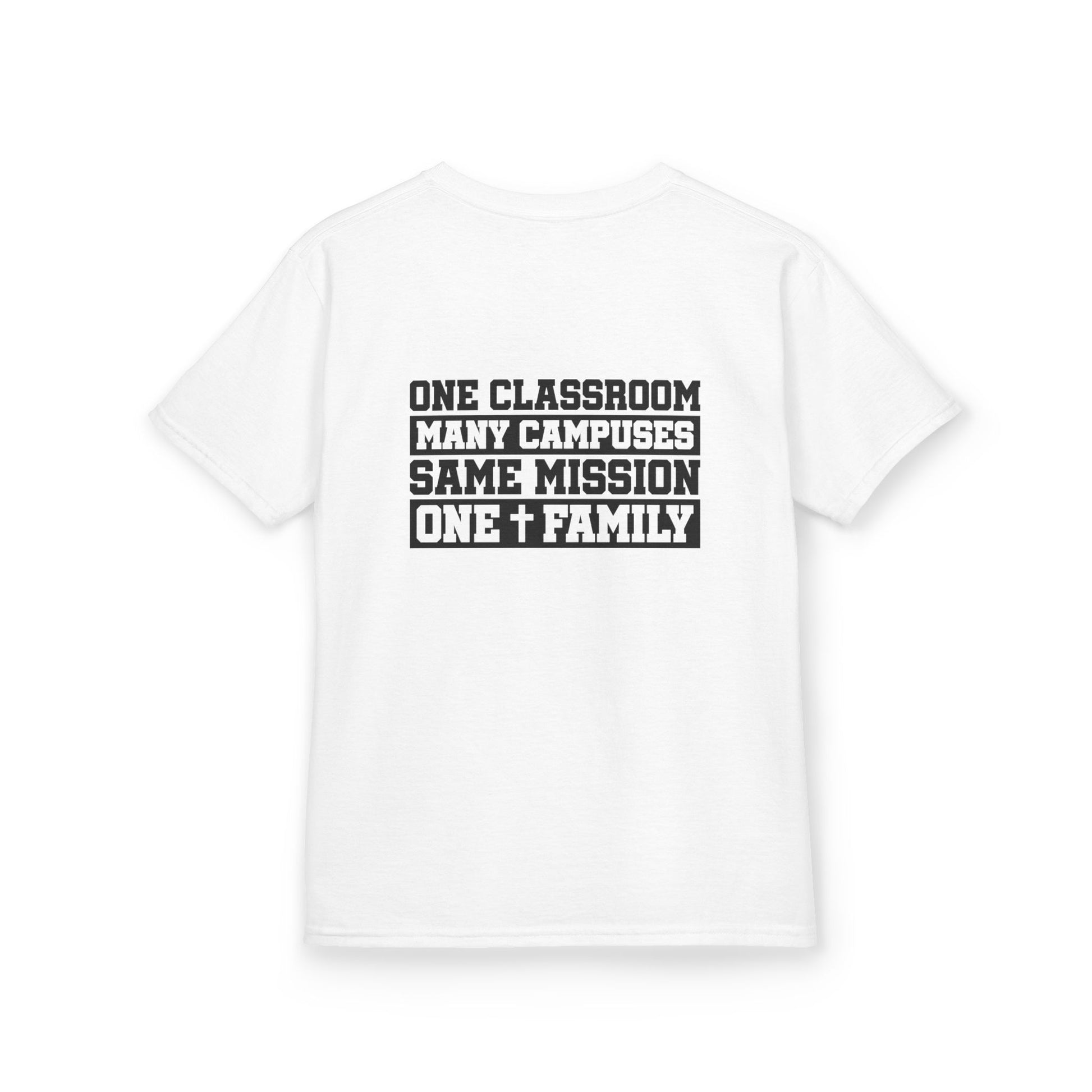 Celebrate the inclusive spirit of Catholic education with this charming Kids "One Classroom, Many Campuses" T-Shirt from Holy Gift Shops – proudly supporting Catholic schools and parishes!