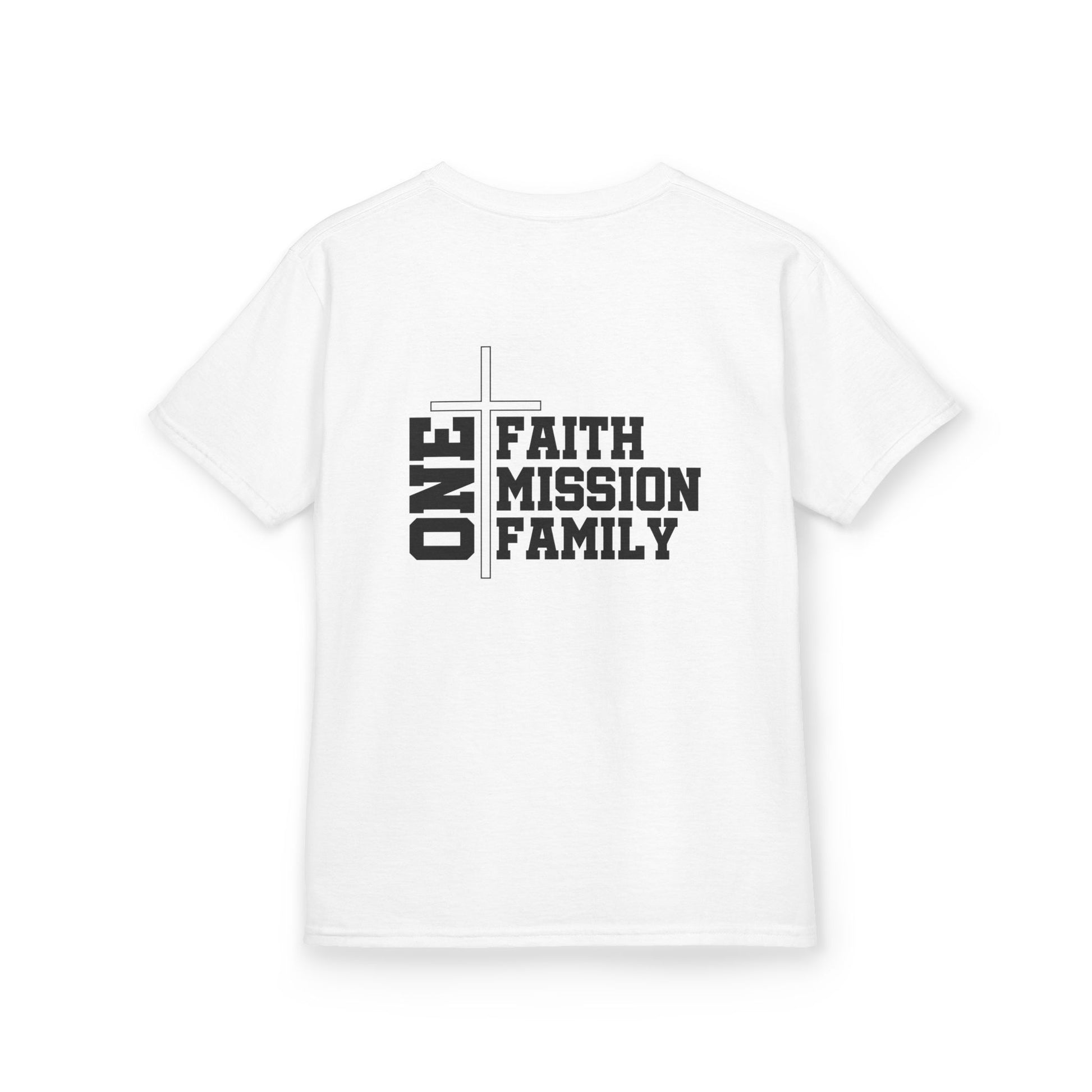 The clean, minimalist design features the powerful message "One: Faith, Mission, Family" – a gentle reminder that we are united as one in our belief, purpose, and love for family. Perfect for everyday play, school days, parish events, or Catholic Schools Week, this soft tee helps children wear their faith with pride and simplicity.