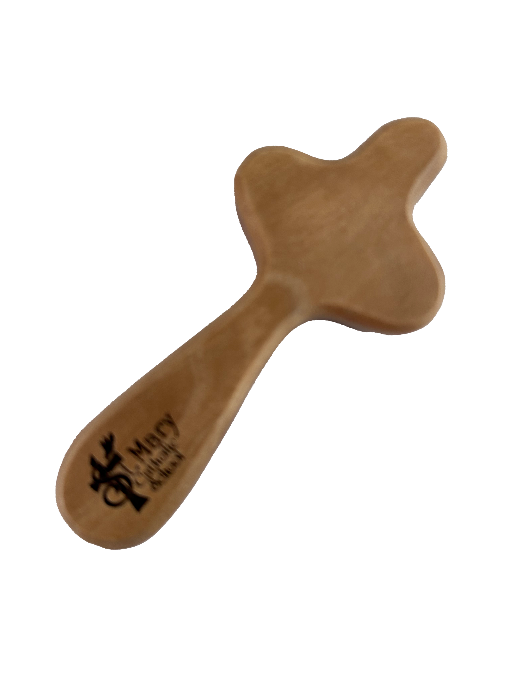 Our pocket holding cross measures 3 3/4 inches by 1 3/4 inches and is meant to fit in the palm of your hand.