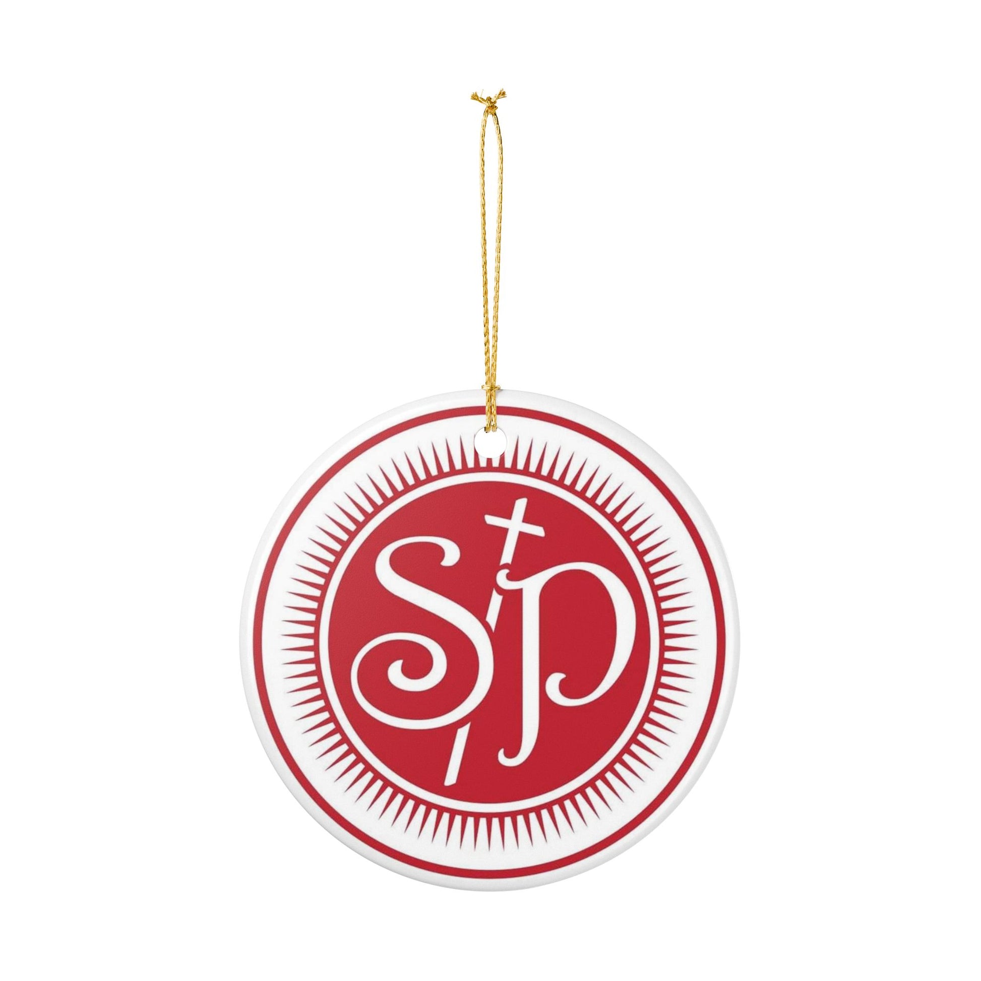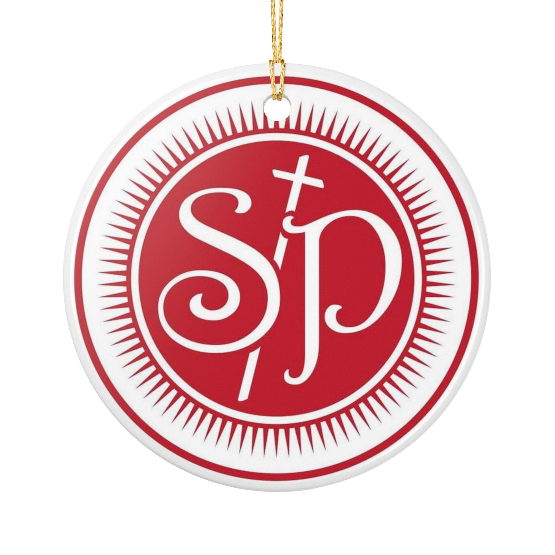 This glossy white ceramic ornament carries a warm, old-world charm—round, sturdy, and printed with a deep red medallion featuring an elegant ‘StP’ monogram framed by radiating sunburst lines. It hangs from a slender gold string that catches light, bringing a subtle, festive shimmer to mantels, trees, or memorial displays. The matte print sits softly against the glossy body, giving the design a tactile, handcrafted feel while the durable ceramic holds its color for years. Use it to mark a meaningful moment, add a touch of seasonal reverence, or tuck it into a keepsake box that will be opened again and again.