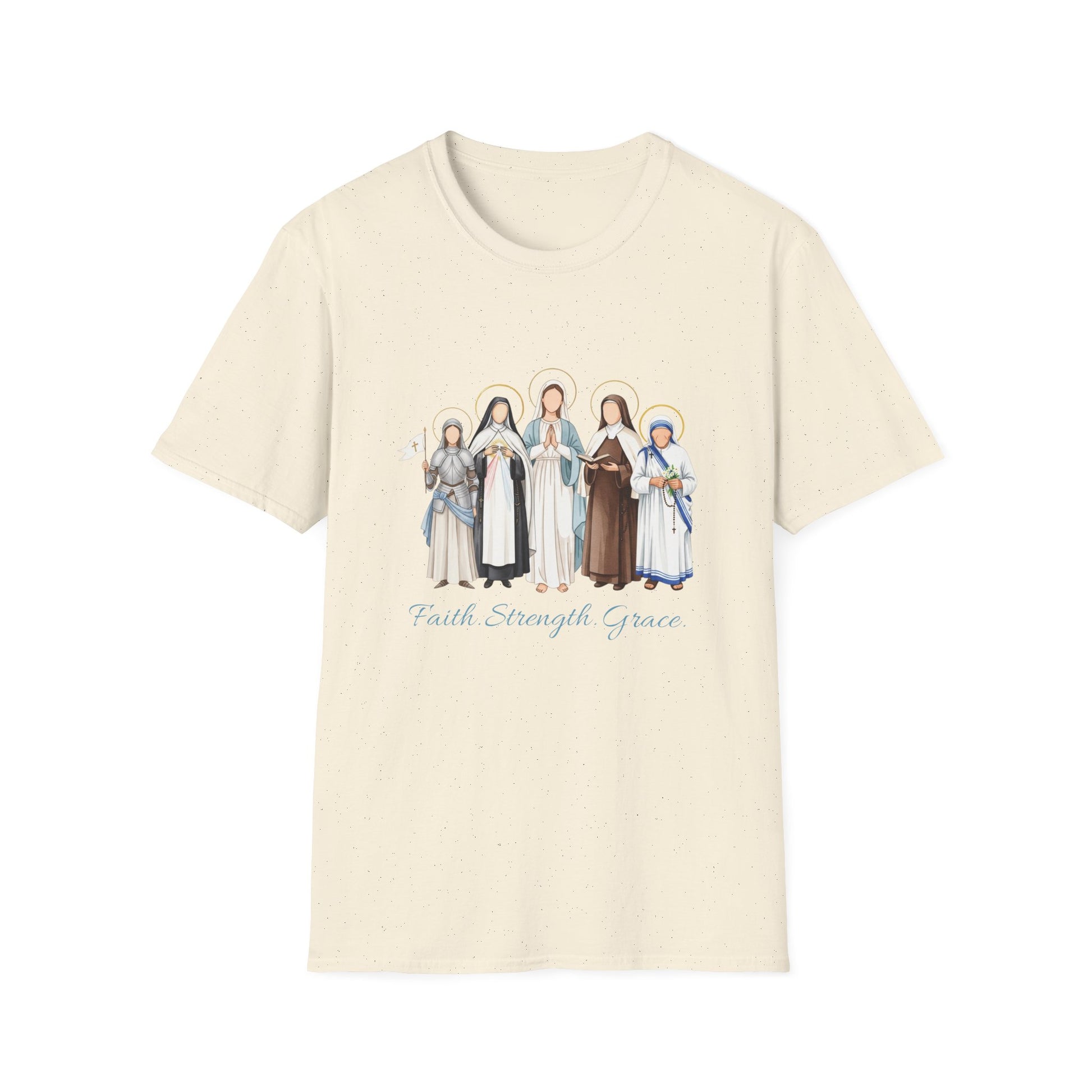 Saints Illustration T-Shirt — "Faith, Strength, Grace" Catholic Devotional Tee