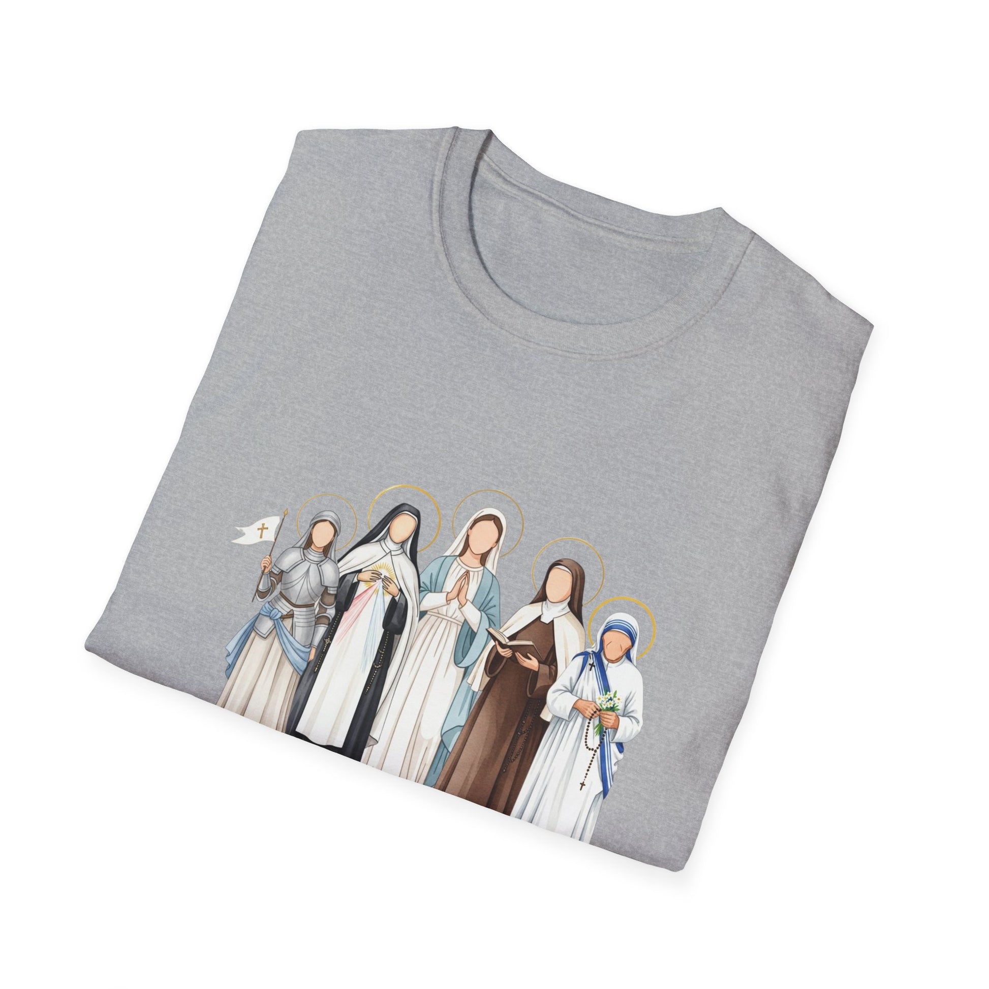 Soft, lightweight, and quietly reverent — this cotton tee brings gentle devotion into everyday wear. The front features a serene illustration of women saints standing together, rendered in soft tones that feel hand-painted. Below the image, a subtle script reads “Faith • Strength • Service,” a whisper of conviction rather than a slogan. Wear it to morning coffee, community events, or while volunteering; it layers easily under a cardigan or stands alone with jeans. The breathable ring-spun cotton and classic crew cut keep the focus on comfy, all-day wear so the message can travel with you—calm, steady, and faithful.