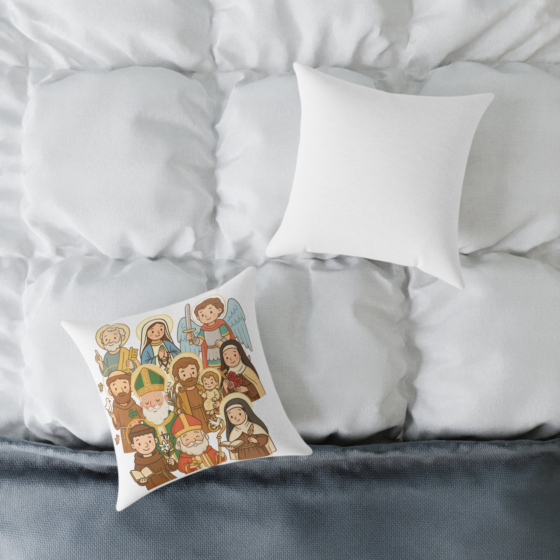 Snuggle up with the saints! This enchanting square pillow brings a heavenly host of whimsical saintly characters into your home, each one rendered in playful, vibrant detail—think rosy-cheeked St. Nicholas, haloed St. Thérèse with her roses, and a cherubic St. Michael ready for dragon-slaying adventures. Printed in radiant color on super-soft poly canvas, it’s the perfect faith-filled flourish for a child’s bedroom, a cozy reading nook, or a parish lounge. Stuffed with plush 100% polyester fill that keeps its shape hug after hug, and finished with a discreet concealed zipper, it’s as practical as it is pious.