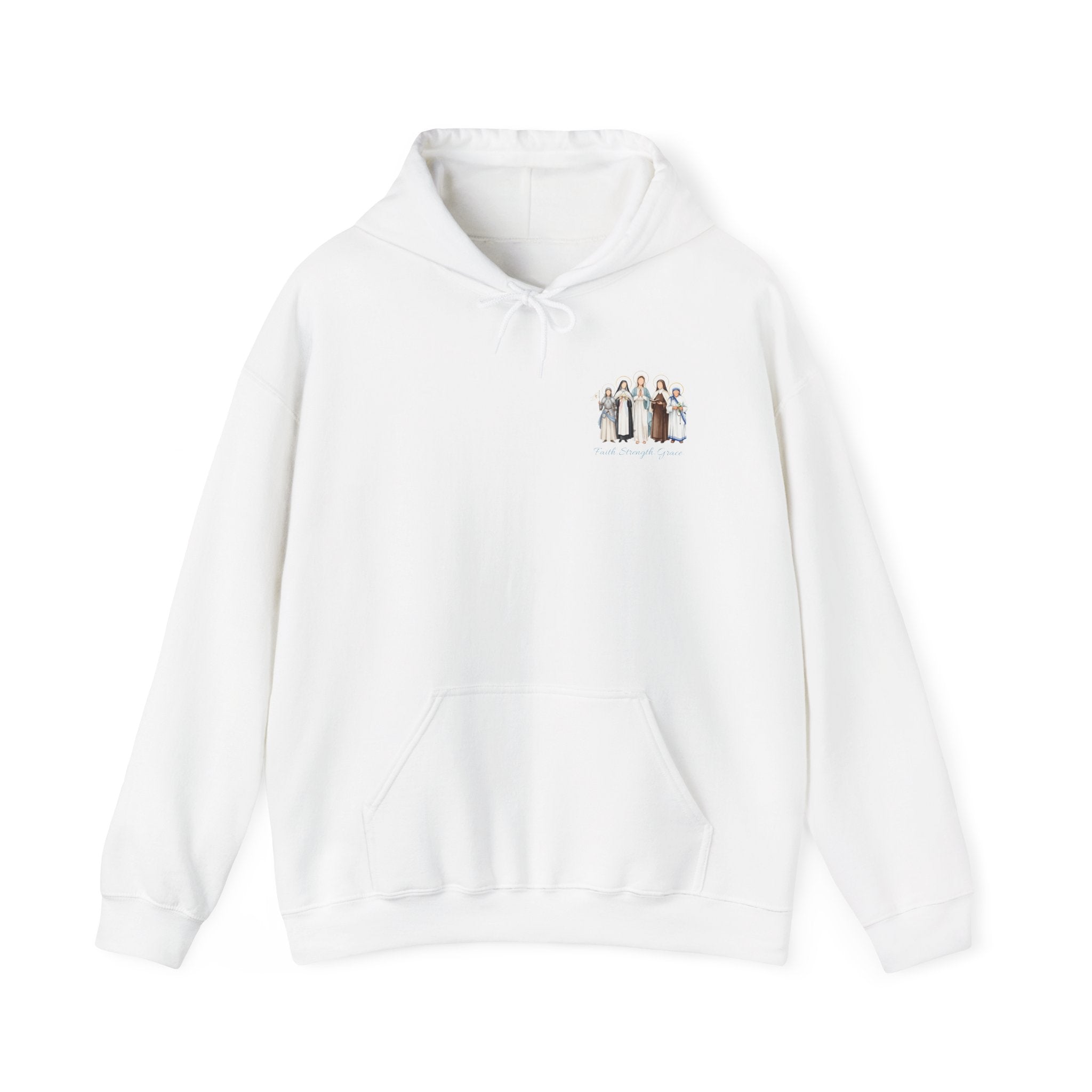 Faith Strength Grace Catholic Hoodie - Women Saints Vintage Chest Graphic Cozy Pullover