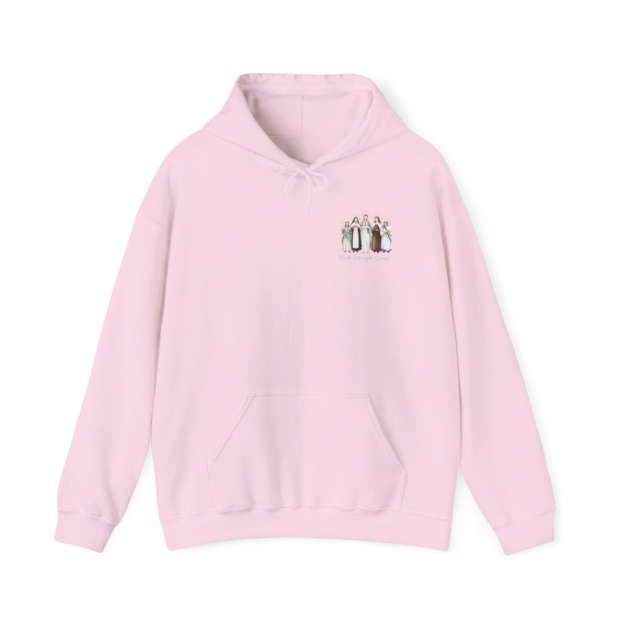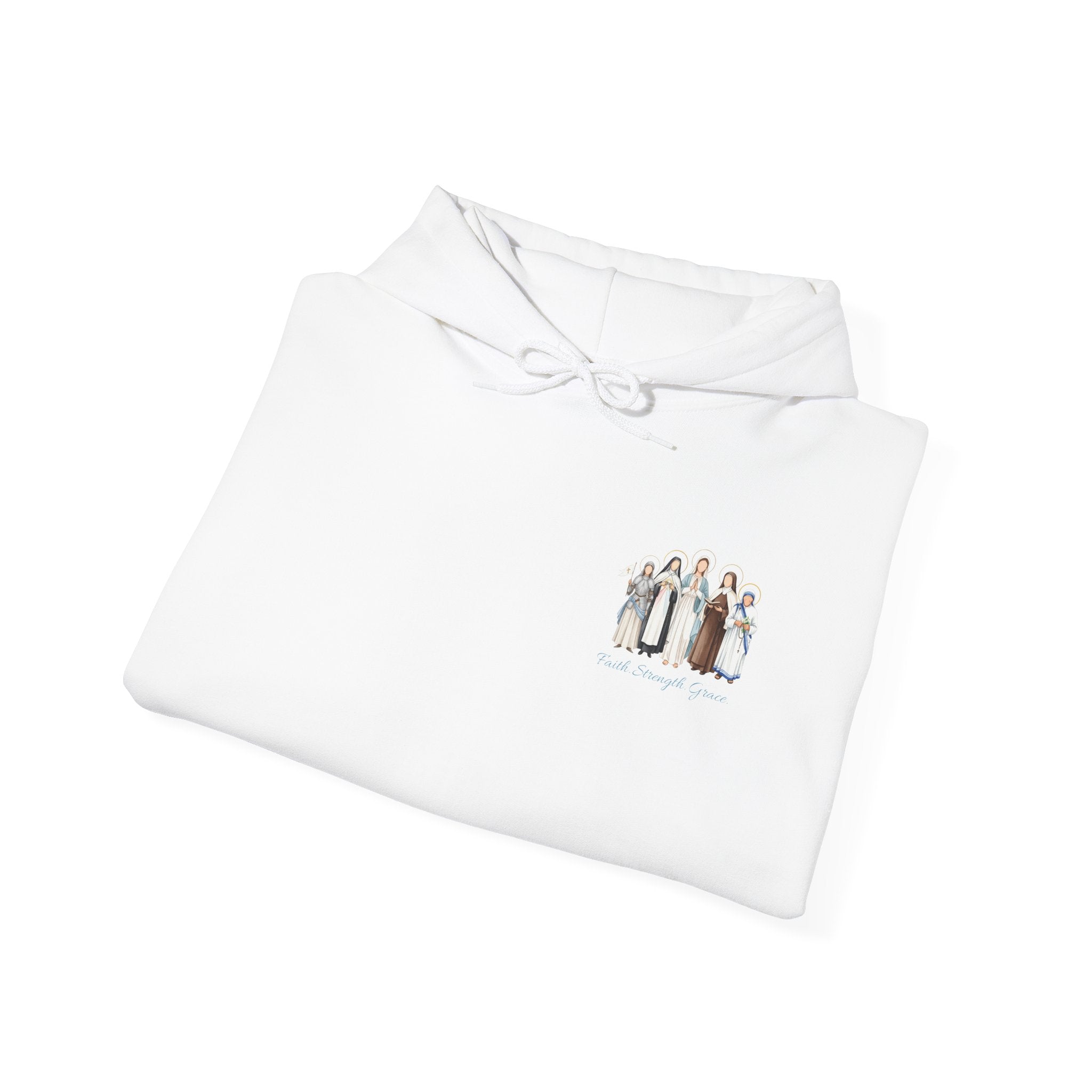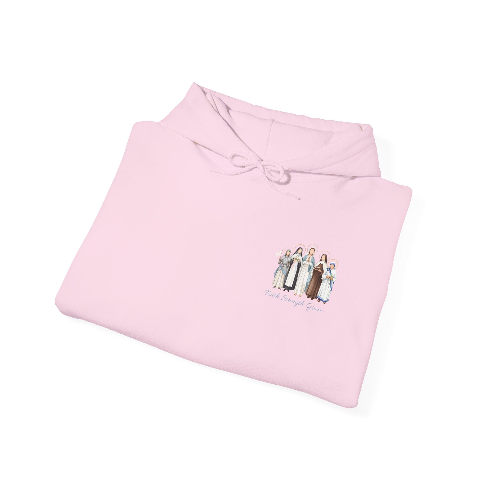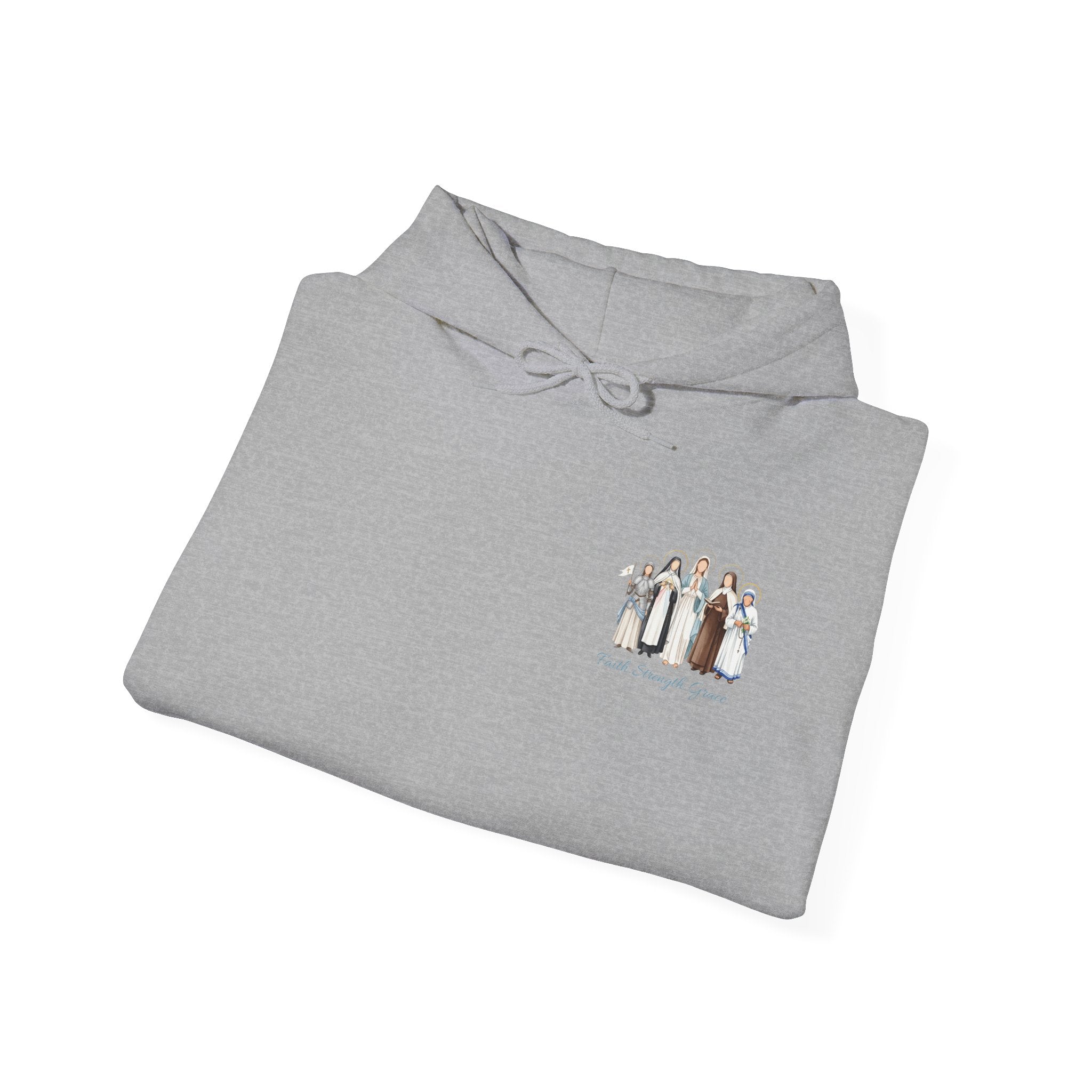 Faith Strength Grace Catholic Hoodie - Women Saints Vintage Chest Graphic Cozy Pullover