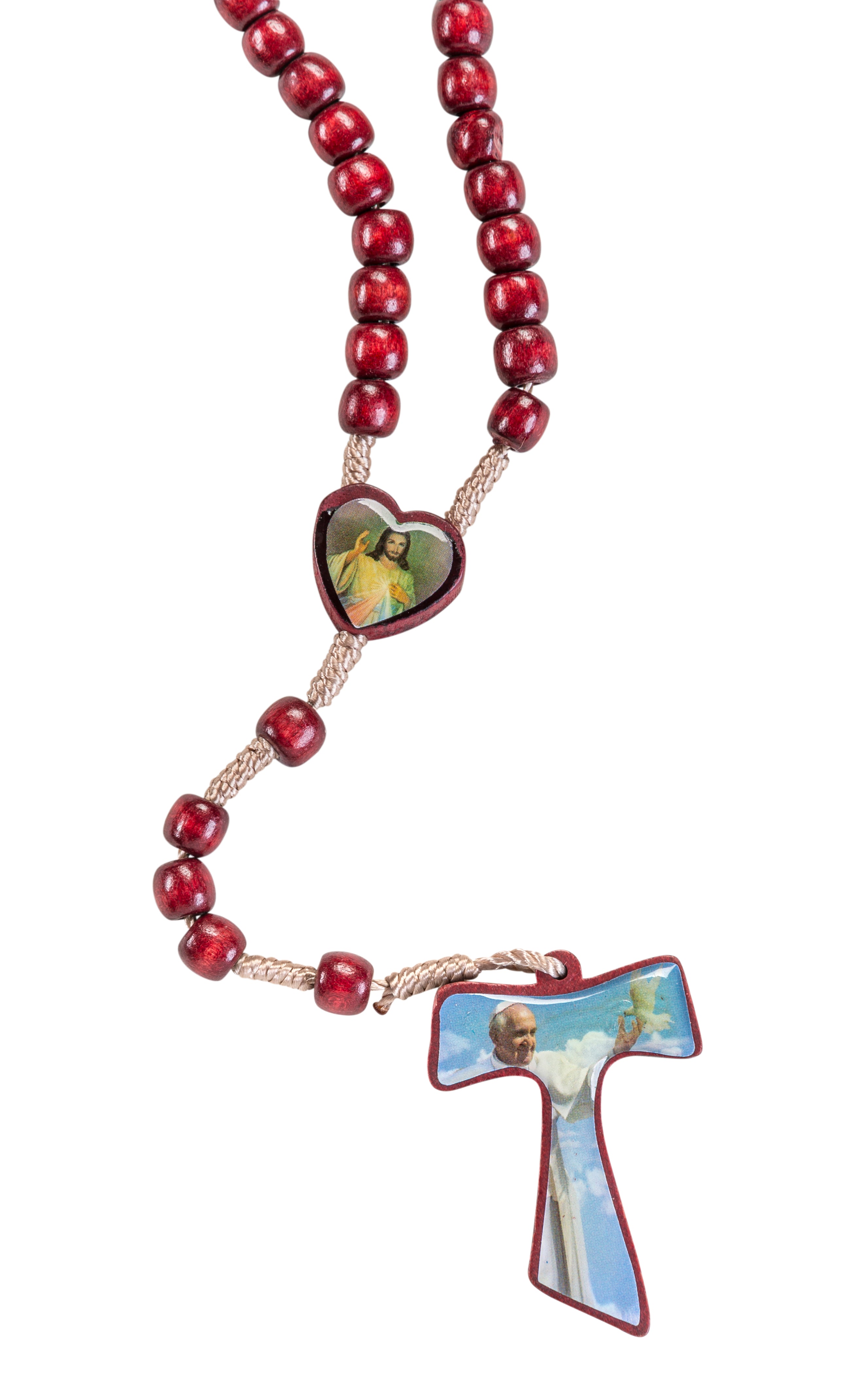 This is a 6mm Mahogany colored beaded rosary made of round wood, featuring a heart-shaped center. One side of the center displays the Divine Mercy image, while the other side showcases Our Lady of Grace. The crucifix is a wood Tau style, with one side depicting St. Francis and the other side showing St. Pope John Paul II.